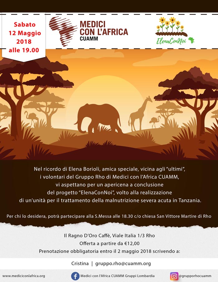Nel ricordo di Elena Borioli, amica speciale, vicina agli ultimi, i volontari del Gruppo Rho di Medici con l'Africa Cuamm, vi aspettano per un apericena a conclusione del progetto "ElenaConNoi",