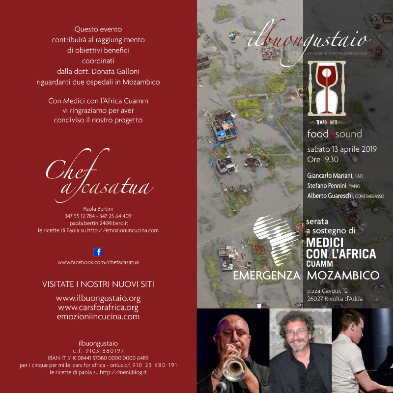 aprile, 2019 Food & Sound sab13apr19:30Food & SoundRivolta d'Adda (CR) Dettagli eventoSerata a sostegno di Medici con l'Africa Cuamm, in particolare per l'emergenza in Mozambico. Scarica la brochure. Dettagli evento Serata a sostegno di Medici con l’Africa Cuamm, in particolare per l’emergenza in Mozambico. Scarica la brochure. Orario(Sabato) 19:30 CalendarioGoogleCal Ricordi Comments are closed.