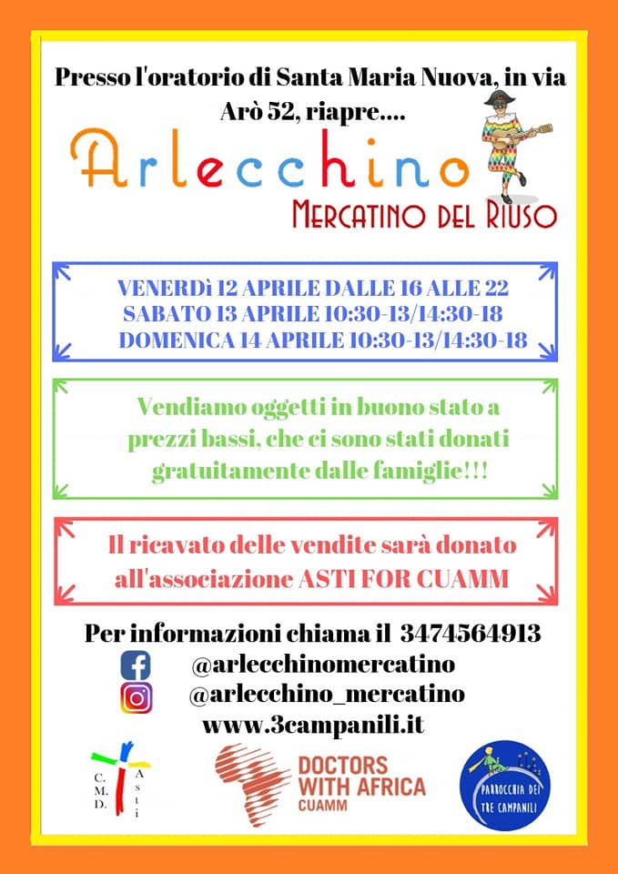 aprile, 2019 Mercatino del riuso ven12aprTutto il giornodom14Mercatino del riusoAsti Dettagli eventoIl ricavato delle giornate sarà devoluto a Medici con l'Africa Cuamm. Dettagli evento Il ricavato delle giornate sarà devoluto a Medici con l’Africa Cuamm. Orarioaprile 12 (Venerdì) - 14 (Domenica) CalendarioGoogleCal Ricordi Comments are closed.