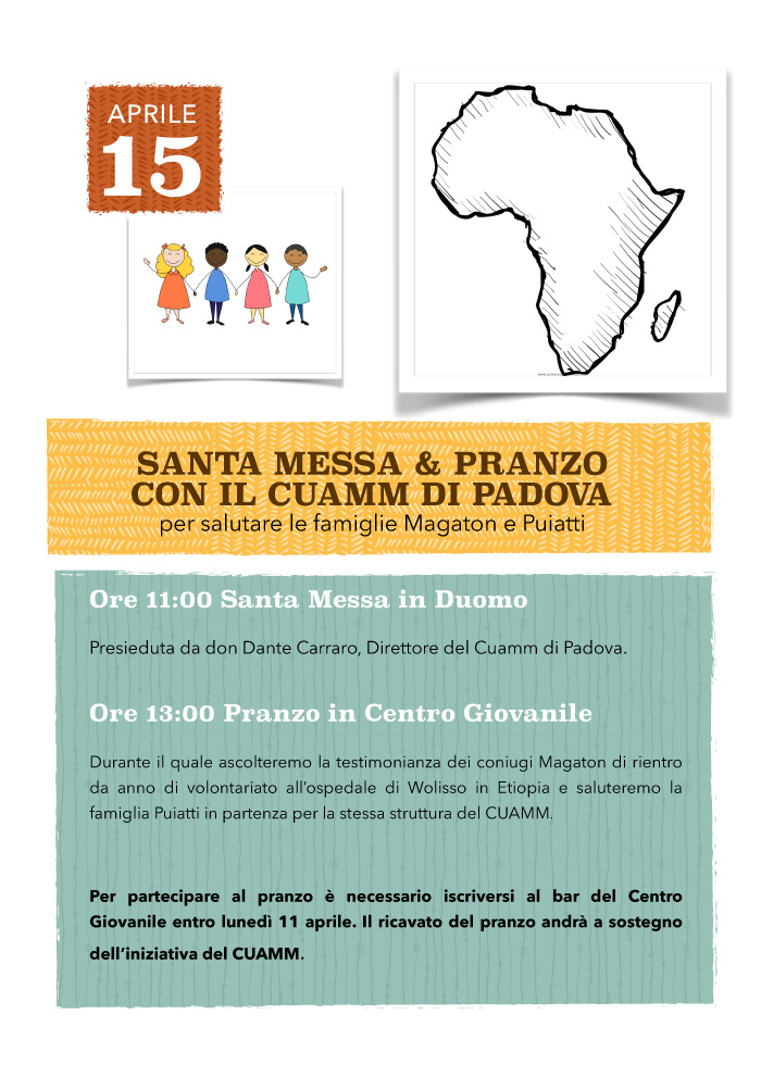 Messa celebrata da don Dante Carraro e, a seguire, pranzo durante il quale i coniugi Magaton racconteranno la loro esperienza di volontariato all'ospedale di Wolisso in Etiopia e passeranno il