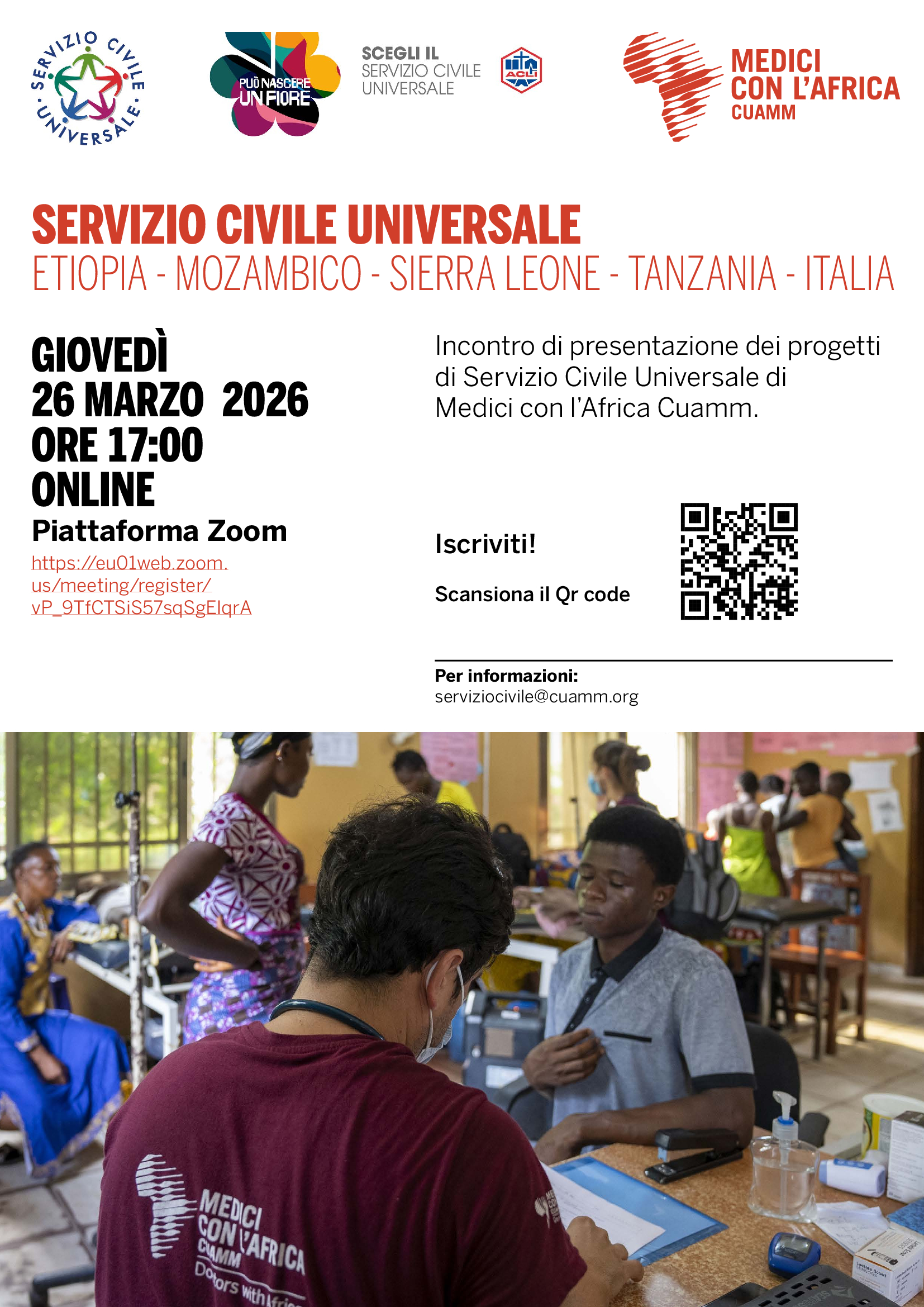 Sono 10 le posizioni aperte per svolgere il Servizio Civile Universale con Medici con l’Africa Cuamm, sia in Africa che in Italia. Per saperne di più, partecipa all’incontro sulla piattaforma Zoom giovedì 26 marzo alle ore 17:00. L’incontro sarà un’occasione per approfondire dubbi o curiosità sul progetto e sui profili che saranno selezionati. Chi prenderà parte all’incontro avrà la possibilità di confrontarsi con i responsabili dell’Organizzazione e con i volontari dell’edizione 2025, attualmente impegnati sul campo.