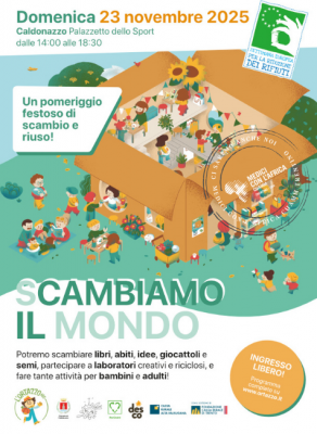 Domenica 23 novembre nel Palazzetto dello Sport di Caldonazzo, dalle 14:00 alle 18:30, si potrà trascorrere un pomeriggio festoso di scambio e riuso in compagnia. Si potranno scambiare libri, abiti, idee, giocattoli e semi, partecipare a laboratori creativi e riciclosi, e fare tante attività sia per bambini ed adulti.